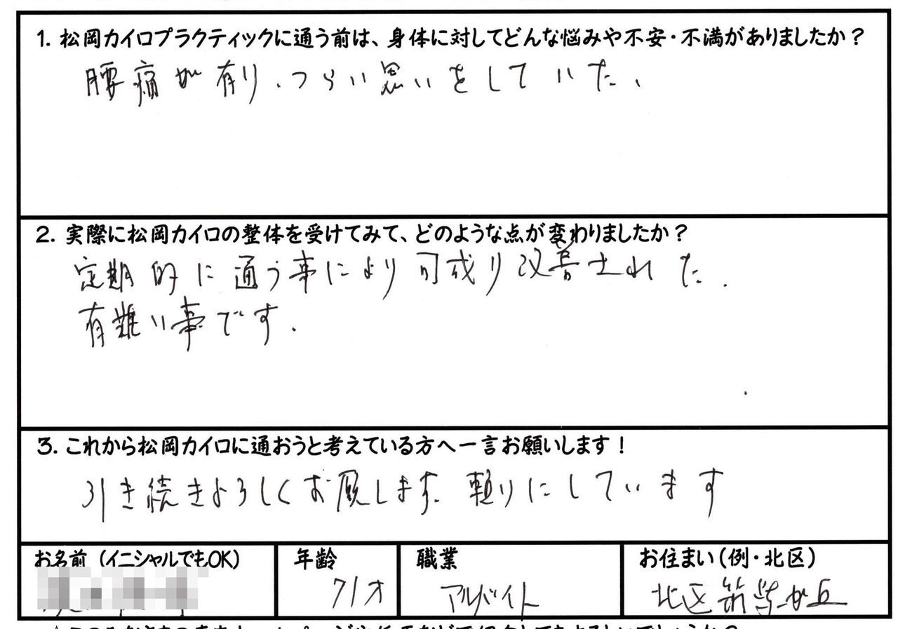 悩みの変化:初回の施術で腰がビックリするくらい軽くなり、色んな不安もお話しすると、とても元気づけられて心身共に軽くなりました。通い始めて長くなりましたが、腰の痛みもシビれもなくなり、15分歩くこともままならなかった私が、旅行に行ったり、丸一日お出かけできるようになり、毎日楽しく過ごすことができています。肩・頭・背中の痛みもなくなり、本当に嬉しいです。